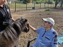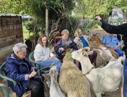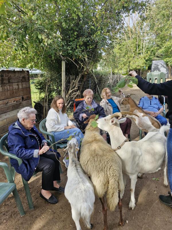 Dès leur arrivée, nos visiteurs ont été accueillis par Karine, zoothérapeute, qui leur a fait découvrir la diversité des animaux de la ferme. Les résidents ont ainsi pu admirer la volière colorée avec poules, coqs et perroquets, donner à manger aux boucs et chèvres, caresser les poneys ainsi que les ânes et observer une truie.