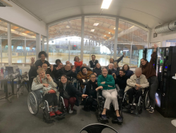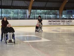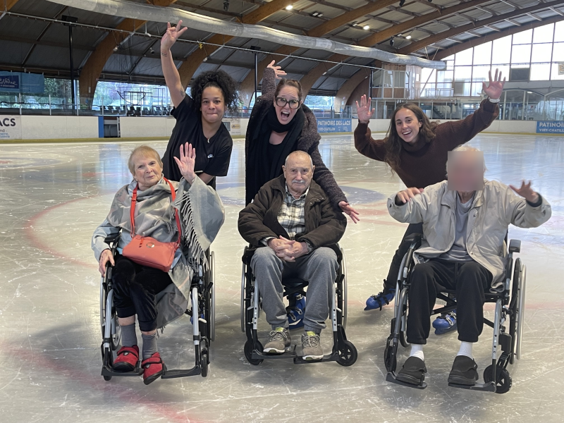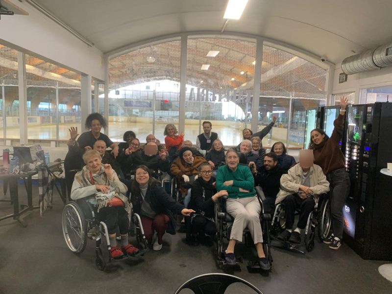 Encadrés par Lise, la kinésithérapeute, Laura, éducatrice en Activité Physique Adaptée (APA), Perlla, aide-soignante, ainsi que Cécile, animatrice, les participants ont pu évoluer en toute sécurité sur la glace. Assis dans leurs fauteuils roulants, ils se sont laissés emporter en douceur par les accompagnatrices, glissant sur la glace au rythme des patins, dans une atmosphère à la fois mélodieuse et joyeuse.